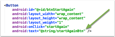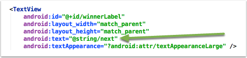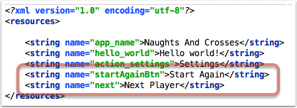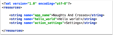 The entry names (highlighted in green) act similarly to variables. By accessing the app_name string entry, the string "Naughts And Crosses" is used instead.